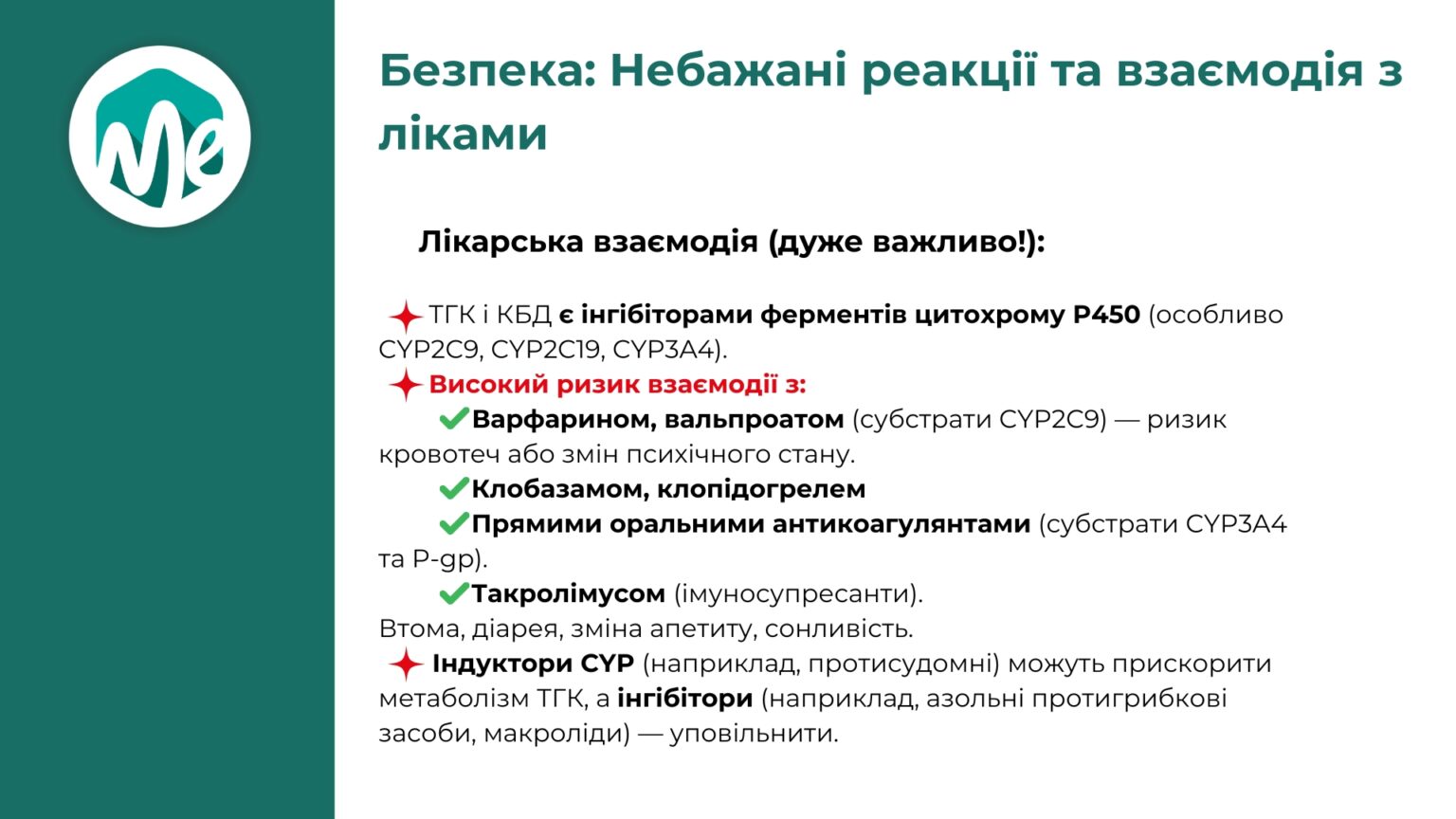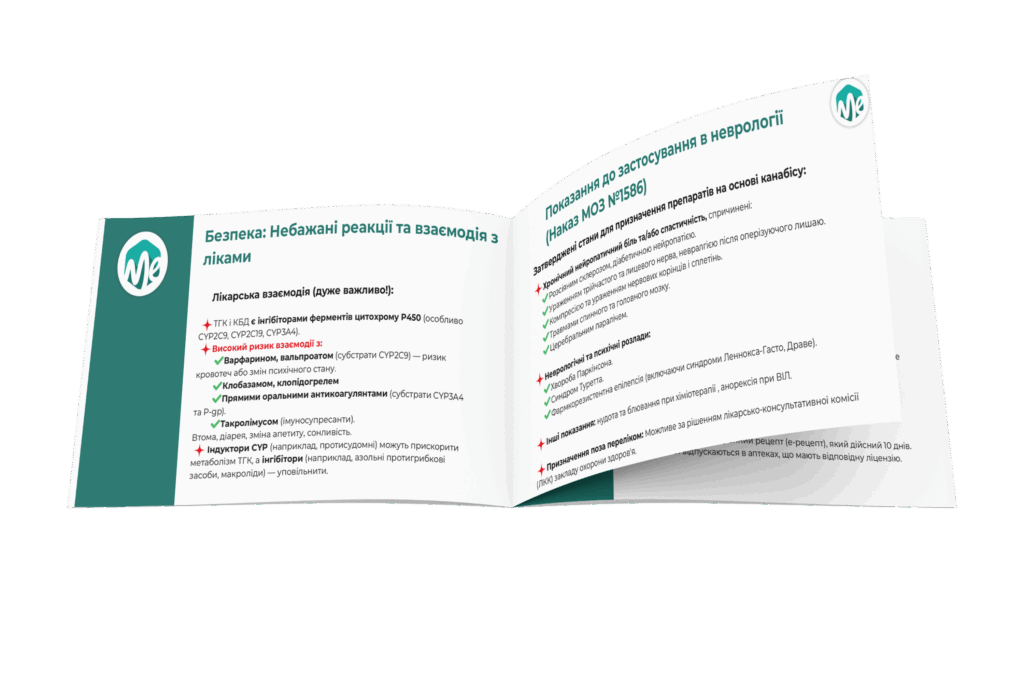 Лікарі отримують покрокові інструкції щодо призначення, починаючи від законодавчих вимог до принципів дозування. Головне правило “починай низько, титруй повільно” доповнюється конкретними стартовими дозами та схемами титрування для різних станів, таких як хронічний біль, епілепсія та тривожні розлади. Пояснюється, в яких клінічних ситуаціях перевагу слід віддавати препаратам з високим вмістом КБД (епілепсія, тривожні розлади), а в яких — збалансованим або з переважанням ТГК (біль, спастичність). Надається детальна інформація про потенційні побічні реакції та, що вкрай важливо, про клінічно значущі лікарські взаємодії, що дозволяє уникнути ускладнень. Лікар отримує ключову інформацію, яку необхідно донести до пацієнта, зокрема про різницю у швидкості дії різних форм препарату та ризики, пов’язані з керуванням автомобілем.
